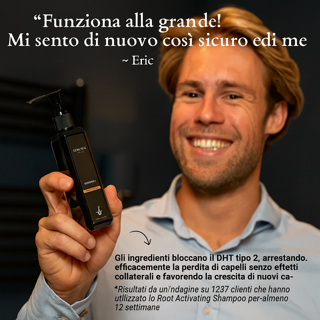 Il nostro Root Activating Shampoo aiuta a rigenerare i capelli persi grazie a una formula esclusiva e brevettata che inibisce il DHT e riattiva le radici.